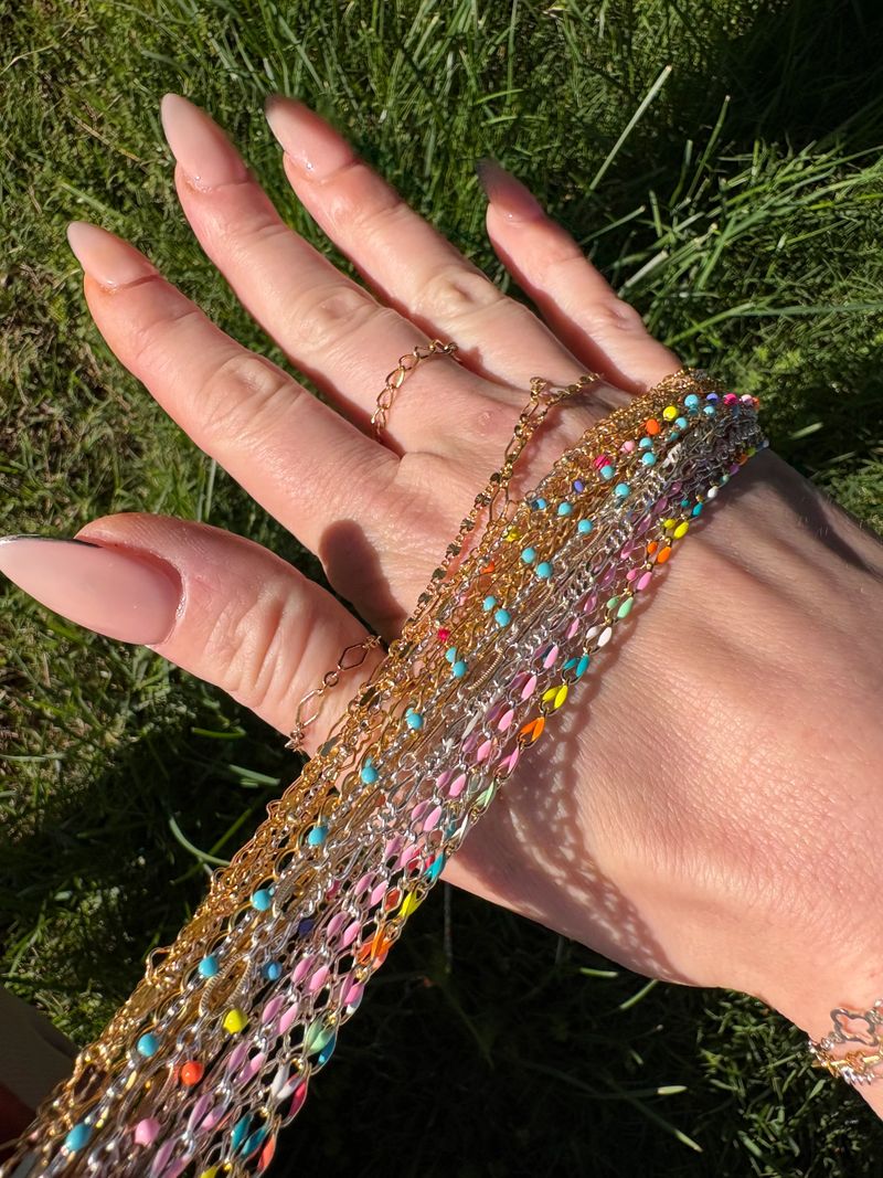 Add a pop of personality with our silver and gold plated color enamel chains. Available in a variety of vibrant colors, these chains are perfect for expressing your unique style while maintaining an elegant, polished finish.